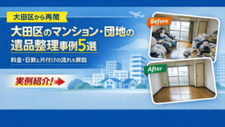 マンション・団地の遺品整理 大田区のマンション団地の遺品整理事例5選|料金・日数と片付けの流れも解説 大田区のマンション・団地で行った遺品整理の事例を5つ紹介。実際にかかった料金や作業日数、片付けの流れを具体的に解説します。エレベーターの有無や高層階の搬出条件など、マンション特有の作業事情も含め、大田区で遺品整理を検討している方の参考になる実例です。 2026.03.06 マンション・団地の遺品整理