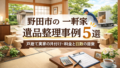 本ページではマンション・団地の事例を中心にご紹介しましたが、市川市での遺品整理は戸建て・アパートなど建物条件により進め方が異なります。集合住宅ではエレベーターの有無や共用部の養生、作業時間帯の制限などが工程に影響します。一方で戸建てでは物置や敷地内の整理が加わることもあります。立ち会いなしでの対応、遠方からのご依頼、売却前整理や退去立会いまでの一括進行など、状況に応じた方法をご案内しています。全体の流れや対応範囲は、下記の総合ページでご確認ください。