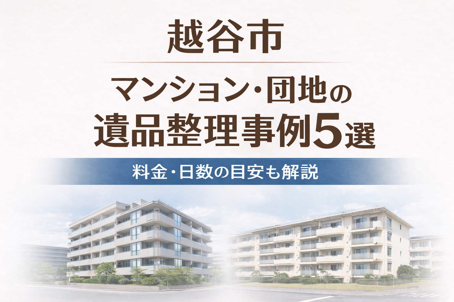 越谷市でマンション・団地の遺品整理をご検討中の方へ。集合住宅では、間取りだけでなく家財量、エレベーターの有無、搬出経路、管理規約などによって作業工程と費用が変わります。本ページでは越谷市で実際に対応した事例をもとに、料金の目安や日数、進め方のポイントを具体的にまとめています。
