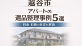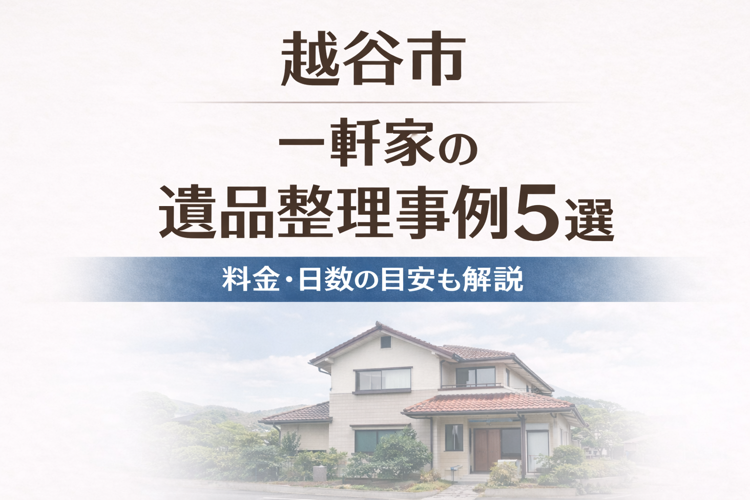 越谷市で一軒家(戸建て)の遺品整理をご検討の方へ。戸建ては部屋数や収納、庭・物置の有無によって家財量が大きく変わり、費用や作業日数も集合住宅とは異なります。本ページでは、越谷市内で実際に対応した戸建ての遺品整理事例をもとに、料金の目安・日数・ご依頼の流れを分かりやすくまとめました。売却前や解体前の整理、遠方からのご依頼など、状況別の進め方もあわせてご紹介します。