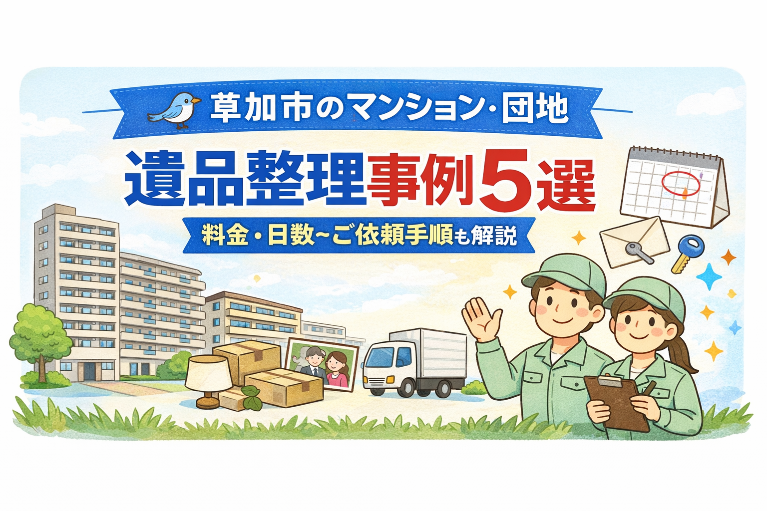 本ページでは、草加市のマンション・団地で実際に行った遺品整理事例を5つご紹介します。料金の目安、作業日数、ご依頼までの流れもあわせて整理していますので、全体像の把握にお役立てください。