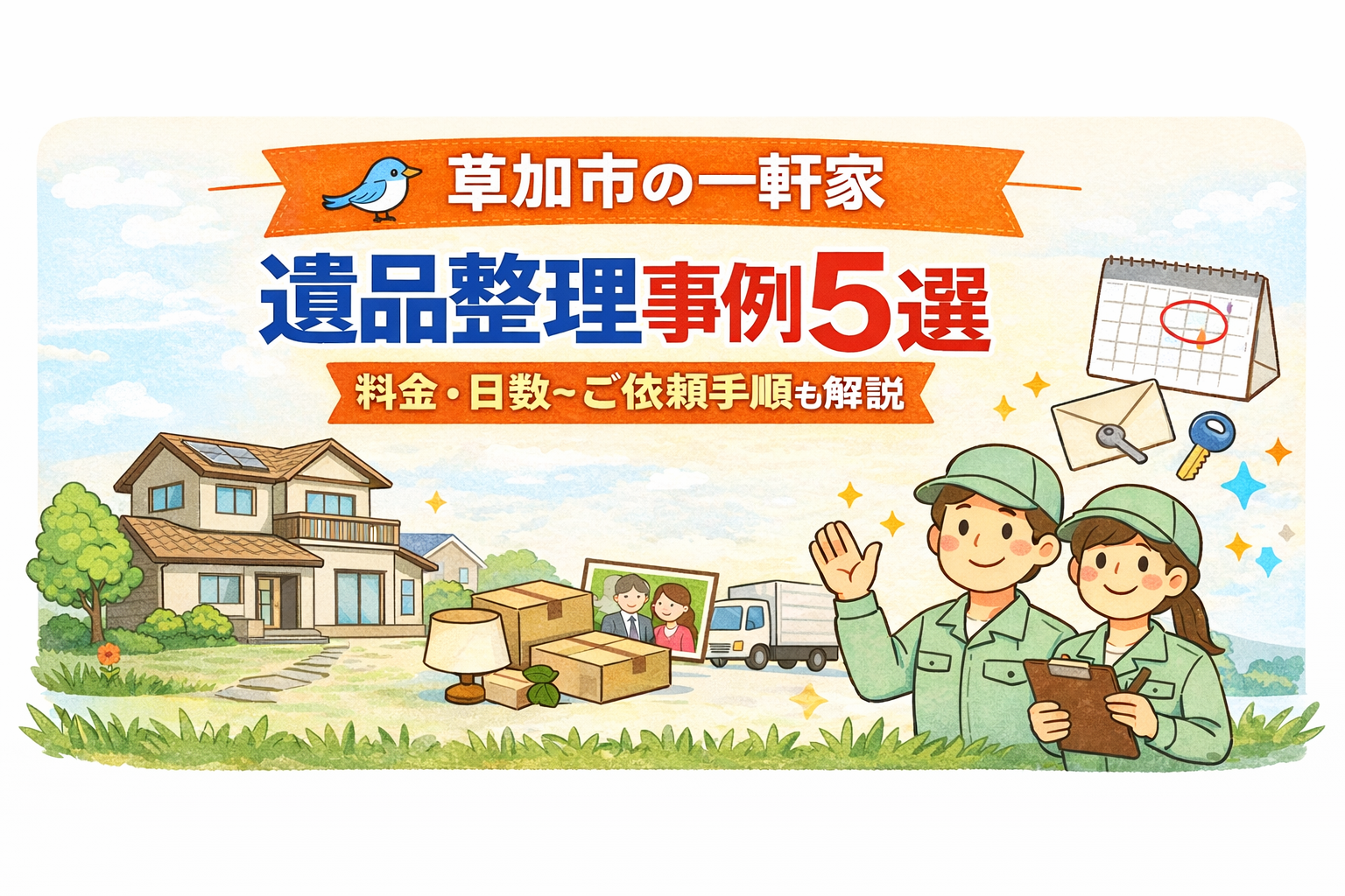 草加市で一軒家(戸建て)の遺品整理をご検討の方へ。戸建ては部屋数や収納が多く、庭や物置が含まれることもあるため、費用や日数は間取りだけでは判断できません。解体前や売却前の整理、遠方からのご依頼など、ご事情によって進め方も変わります。本ページでは、草加市での戸建て遺品整理の事例をもとに、料金の決まり方と進め方のポイントを整理しています。