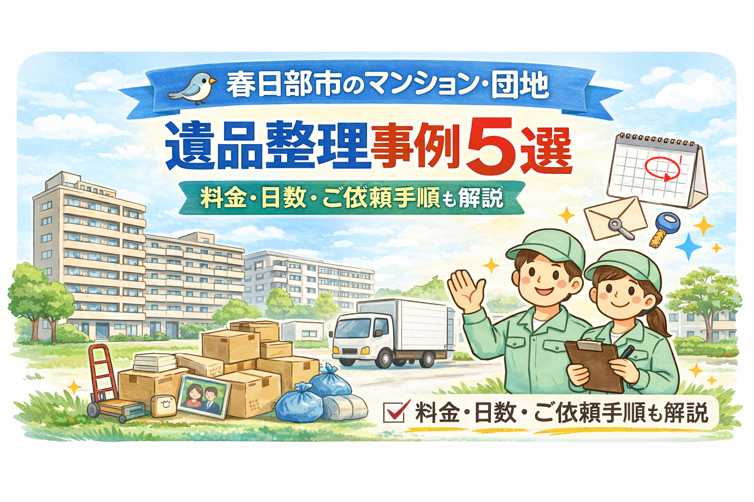 本ページでは、春日部市内で実際に行ったマンション・団地の遺品整理事例を5つご紹介し、料金の目安・作業日数・ご依頼から完了までの流れを整理しました。退去期限が迫るケースや、立ち会いが難しい場合の進め方についても解説しています。