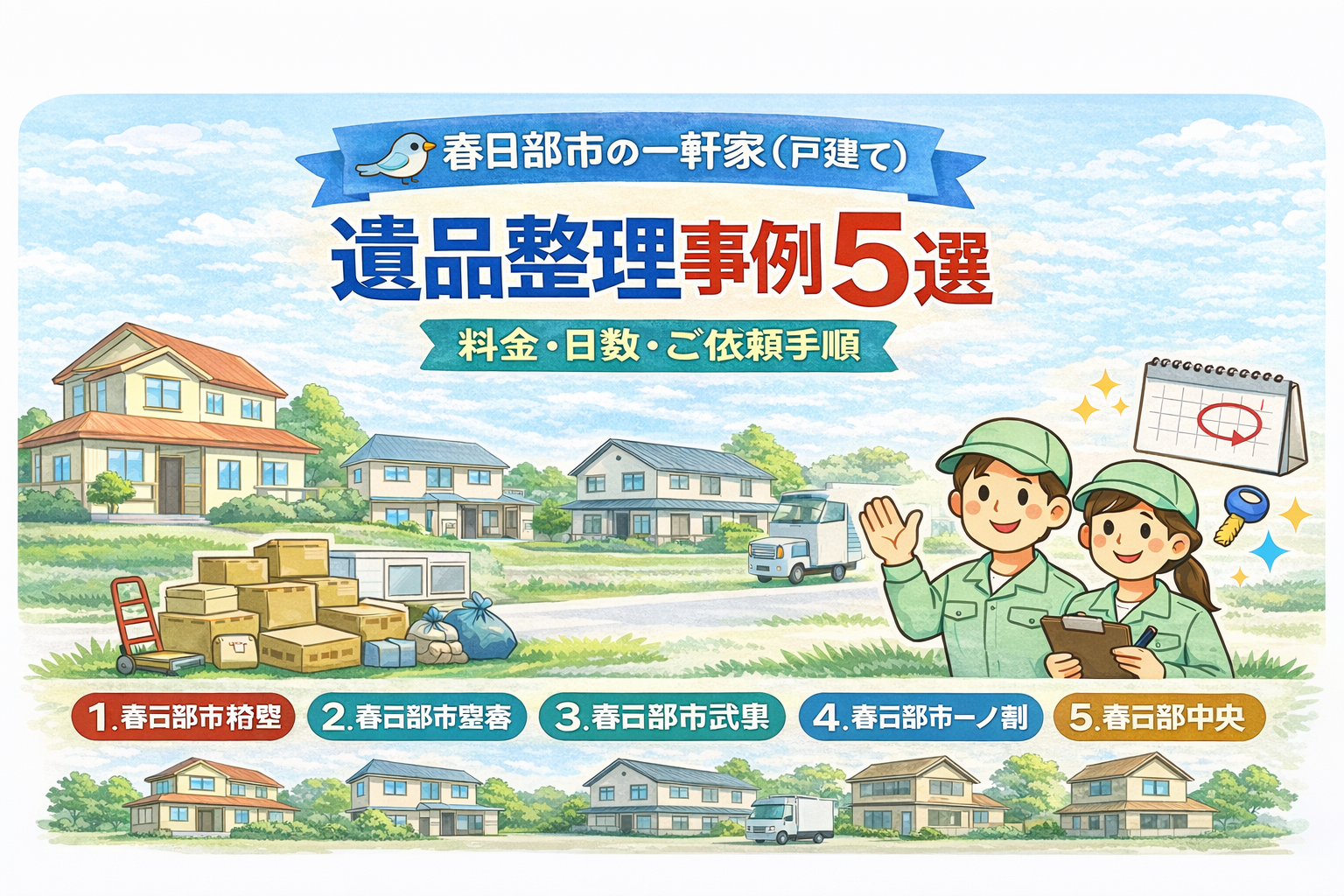 本ページでは、春日部市で実際に行った一軒家の遺品整理事例を5つご紹介し、料金の目安・作業日数・ご依頼から完了までの流れを整理しました。売却前や解体前の整理についても分かりやすくまとめています。
