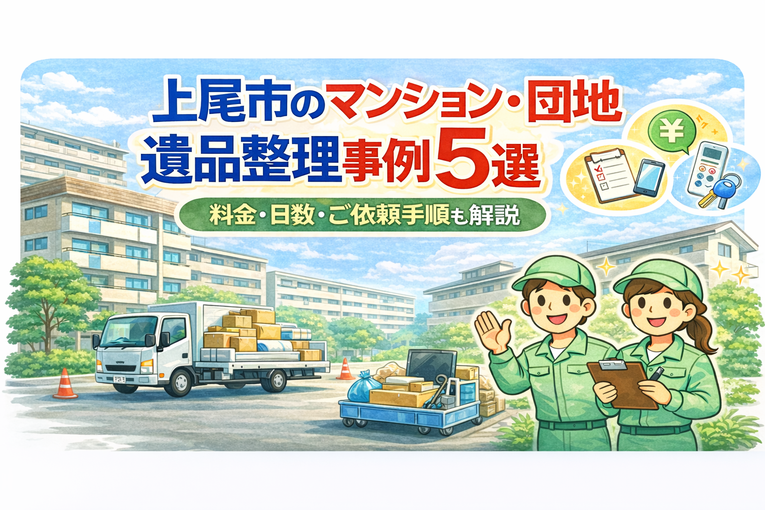 上尾市でマンション・団地の遺品整理をご検討中の方へ。マンションや団地の場合、エレベーターの有無、共用部分の養生、管理規約の確認など、一軒家とは異なる配慮が必要になります。同じ間取りでも家財の量や搬出条件によって、作業人数やトラック台数は変わります。