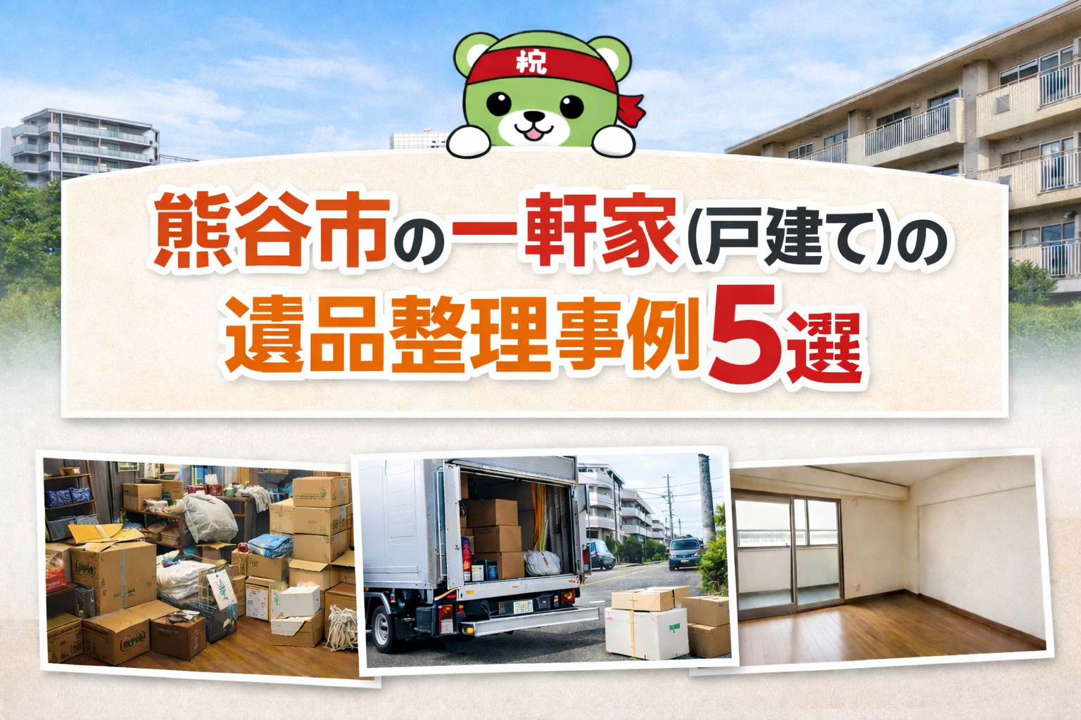 本ページでは、熊谷市で実際に対応した一軒家の遺品整理事例を5つご紹介しながら、料金の決まり方・作業日数・ご依頼から完了までの流れを分かりやすくまとめました。