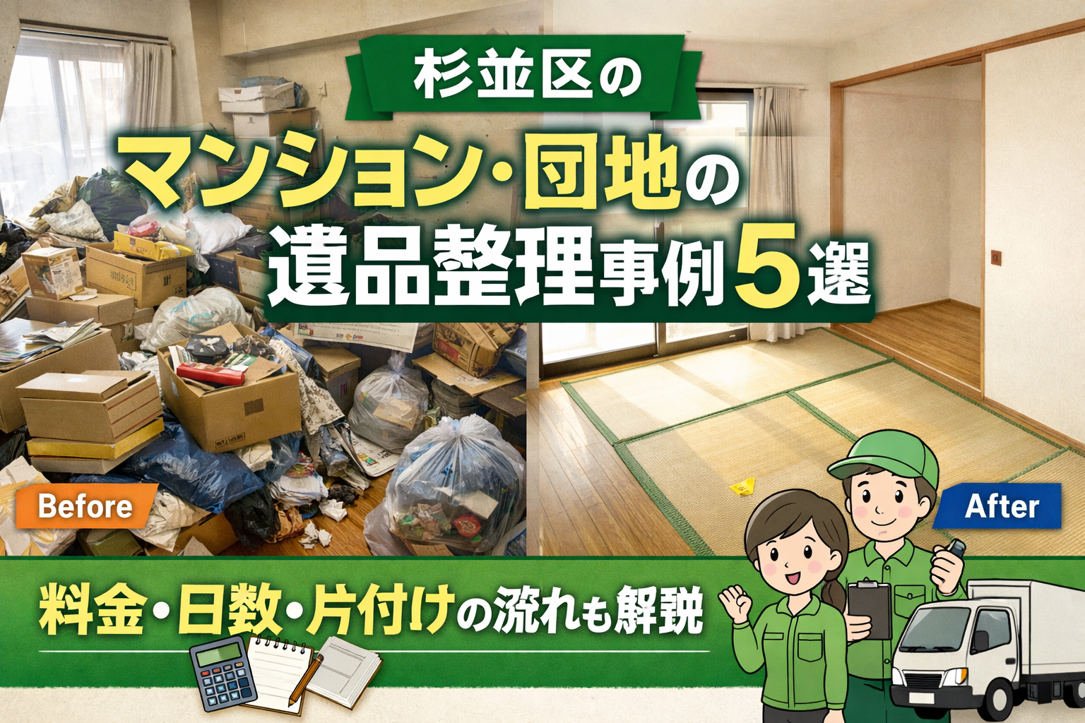 本ページでは、杉並区内で実際に対応したマンション・団地の事例をもとに、料金の決まり方や日数の目安、片付け完了までの流れを具体的にご紹介します。