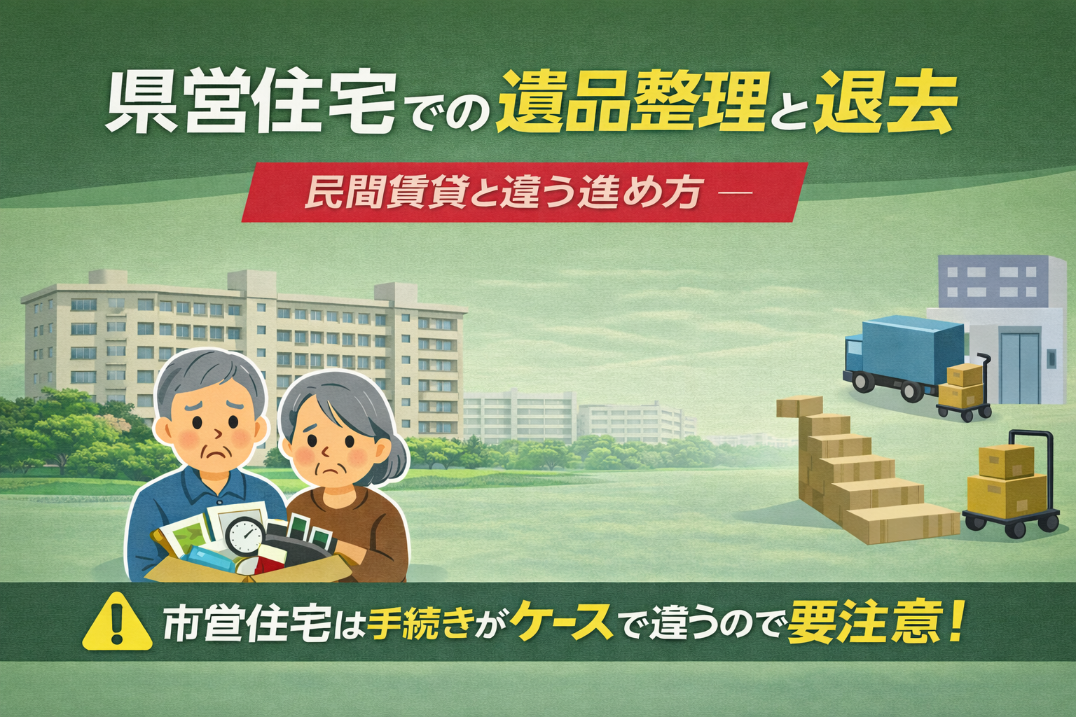 このページでは、県営住宅で亡くなられた場合の退去手続きと遺品整理の流れを、実務の順序に沿ってわかりやすく解説します。
