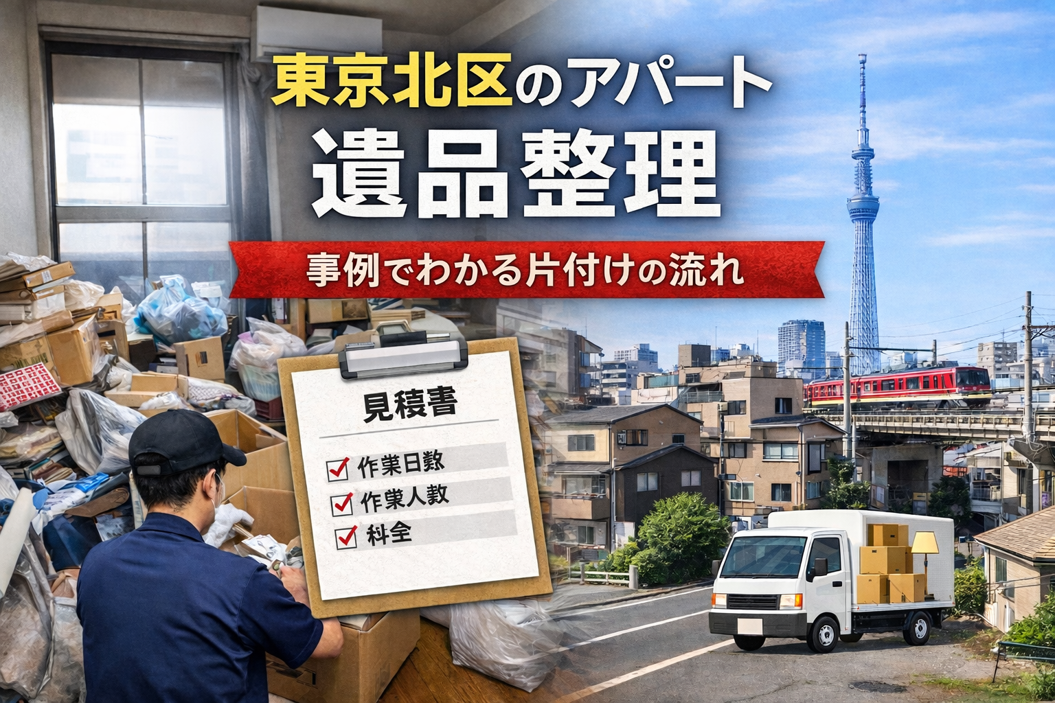 東京北区は、赤羽・王子・十条・東十条などの駅周辺に古くからのアパートや小規模賃貸住宅が多く、単身者のお住まいで遺品整理が必要になるケースが少なくありません。アパートの場合は、退去期限・階段搬出・駐車条件などの影響を受けやすく、同じ間取りでも作業日数や料金が変わることがあります。