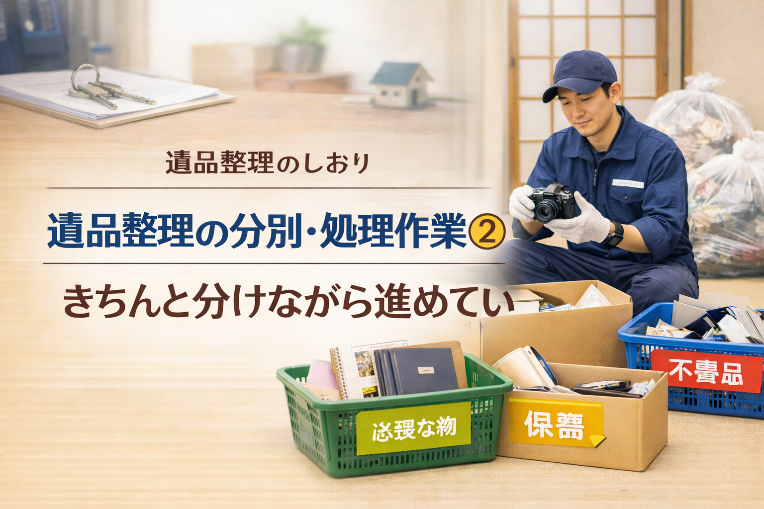 遺品整理の分別・処理作業では、ご遺族様のご意向を大切にしながら、一つひとつ確認し、丁寧に分けて進めていきます。