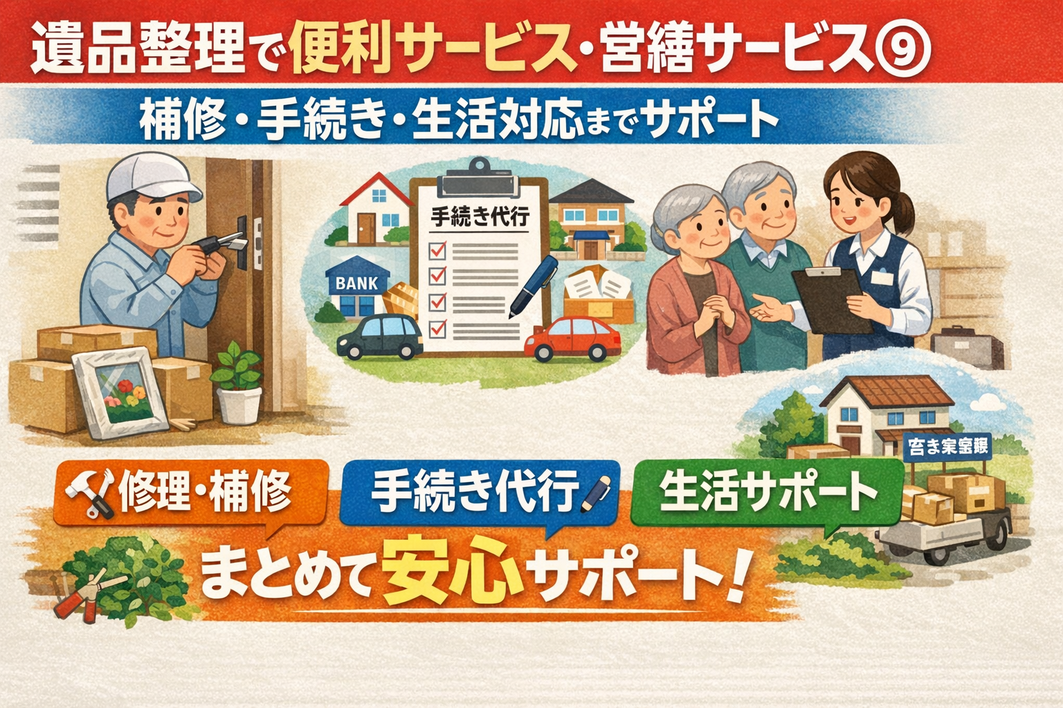 本ページでは、遺品整理後に発生しやすい「補修・手続き・生活対応」に関する便利サービス・営繕サービスについて、実務的な内容を中心にご紹介します。状況に応じてどのような対応が必要になるのか、全体像の把握にご活用ください。